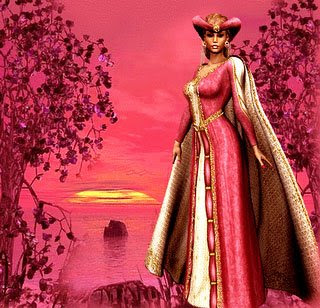 A Pomba-Gira Rainha das Sete Encruzilhadas adora a cor Maravilha, Vermelho, Preto e Dourado trazendo na mão um cedro de ouro.